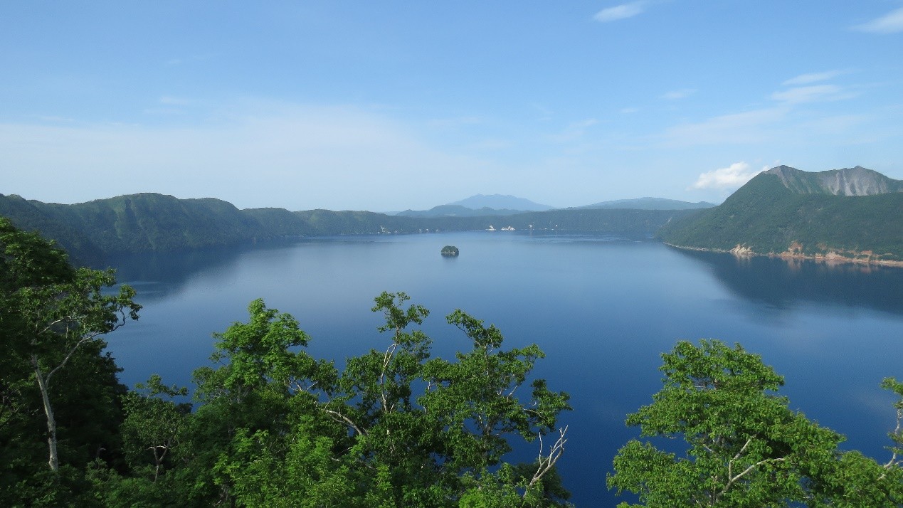 摩周湖也是一個火山口湖,雖然湖面不大,卻因湖水清潵透明度,形成一種夢幻的寶藍色,被日本人視為道東必訪勝地。周圍火山群峰雖不高,但常讓此處形成雲霧繚繞,不易見到清晰的湖面,憑添神密的色彩。